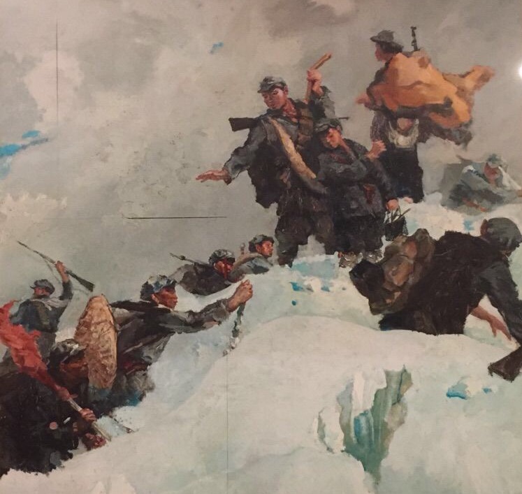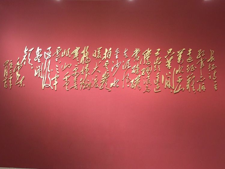 进入展厅,写有毛主席那首《七律·长征》诗词的红色巨幅展板就矗立在眼前:红军不怕远征难,万水千山只等闲。五岭逶迤腾细浪,乌蒙磅礴走泥丸。金沙水拍云崖暖,大渡桥横铁索寒。更喜岷山千里雪,三军过后尽开颜。”这首脍炙人口、气势磅礴的诗作曾被谱成曲子广为传唱,因此那熟悉的旋律就立刻在耳边响起。紧接着映入眼帘的是红军爬雪山的巨幅画作。这诗文和画作穿越时空,将大家带回到80年前那“雪皑皑,野茫茫”的长征路上。