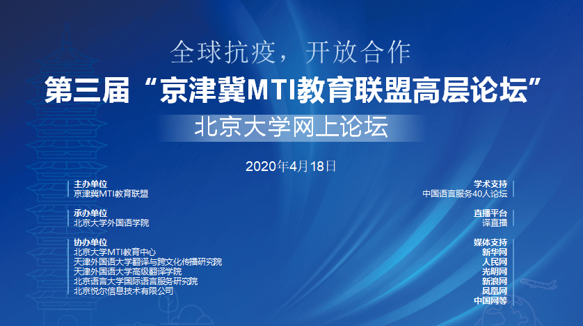 4月18日,在外院新楼举办以“全面凝聚抗疫合力,加强京津冀语言服务合作”为主题的“第三届京津冀MTI教育联盟高层论坛”北京大学网上论坛。论坛由京津冀MTI教育联盟主办,博鱼体育承办,中国语言服务40人论坛提供学术支持,新华网、人民网、光明网、新浪网、凤凰网、中国网等提供媒体支持,论坛译直播平台同步直播,14442人收看同步直播。外院技术服务团队全程提供技术支持和协助,全力保障论坛的顺利进行。
