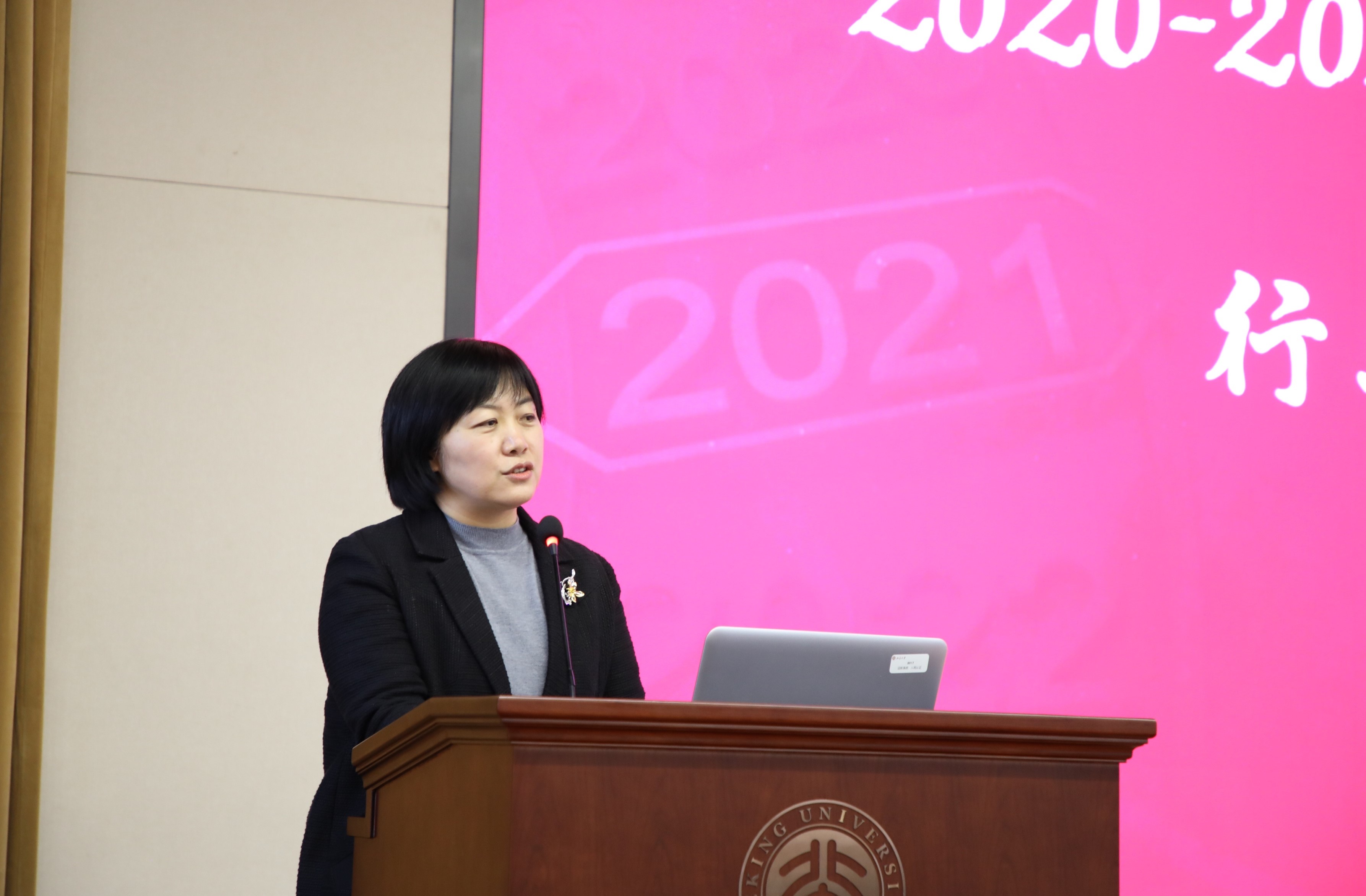 张冬梅老师首先肯定了行政团队2020-2021学年的工作。经过不懈的努力,行政团队在校内各部门的评优、评选中获得了可喜的成绩,疫情防控工作也得到了学校、学院领导和教师的高度肯定。张冬梅老师以财务办公室提供无等侯报销服务为例,希望各部门简化、优化办事流程,为自己做加法,为师生做减法。鼓励大家继续努力,以问题为导向,建立大局意识,在紧张中保持镇定,在繁忙中保持从容,做职业化的行政人员。