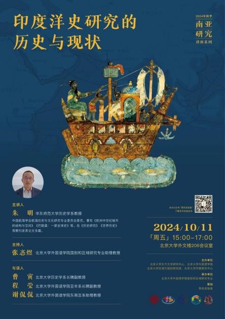 2024年10月11日,华东师范大学历史学系朱明教授应邀为我校师生开展题为“印度洋史研究的历史与现状”的讲座。本次讲座是由北京大学东方文学研究中心、外国语学院、区域与国别研究院和印度研究中心主办,外国语学院国别和区域研究专业承办的2024年秋季学期南亚研究系列讲座的第一讲。讲座由博鱼体育助理教授张忞煜主持,华东师范大学历史学系副教授刘伟才、北京大学历史学系长聘副教授曹寅、外国语学院长聘副教授程莹、助理教授谢侃侃参与讨论。