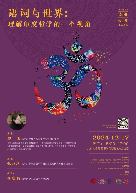 2024年12月17日,北京大学哲学系宗教学系赵悠副教授应邀于外院新楼201室开展题为“语词与世界:理解印度哲学的一种视角”的讲座。本次讲座是由北京大学东方文学研究中心、外国语学院、区域与国别研究院和印度研究中心主办,外国语学院国别和区域研究专业承办的2024年秋季学期南亚研究系列讲座的第五讲。讲座由博鱼体育国别和区域研究专业助理教授张忞煜主持,博鱼体育博士后李晓楠参与讨论。