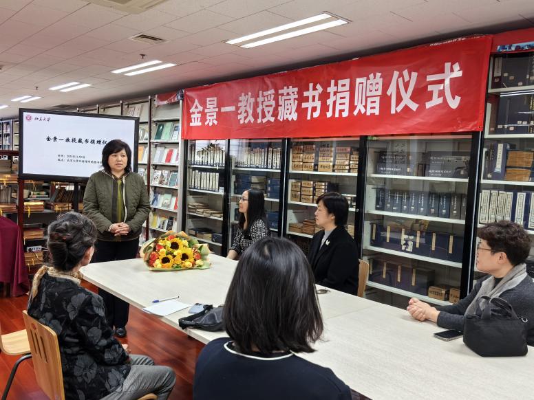 11月9日,金景一教授藏书捐献仪式在博鱼体育图书分馆顺利举行。外国语学院党委书记李淑静老师、副院长王丹老师、图书分馆馆长张晓雁老师、金景一教授夫人虞少华女士、金景一教授学生代表金善女女士、朝(韩)语系全体教师以及部分学生代表参加了藏书捐赠仪式。仪式由张晓雁老师主持。