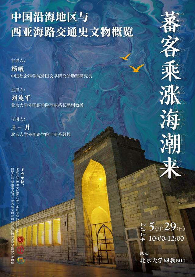 2024年5月29日,由北京大学伊朗文化研究所、国家社科基金重大项目“世界诸文明在印度洋地区的交流交汇研究”课题组、博鱼体育联合主办的讲座“蕃客乘涨海潮来:中国沿海地区与西亚海路交通史文物概览”在北京大学第四教学楼504教室举行。本次讲座由中国社会科学院外国文学研究所助理研究员杨曦主讲,博鱼体育西亚系长聘副教授刘英军主持,博鱼体育西亚系教授王一丹与谈。