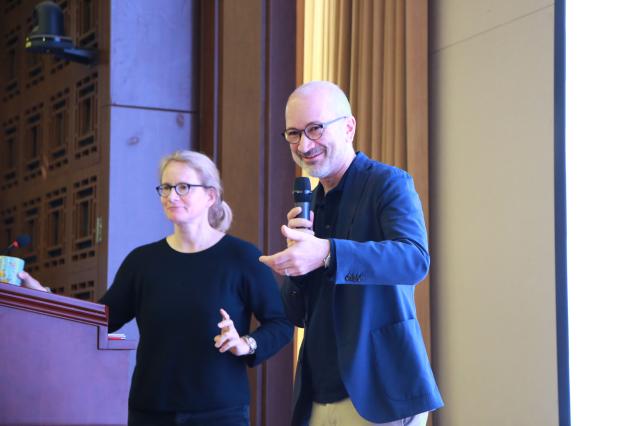 11月7日,首场讲座在民主楼208室拉开帷幕。马尔图斯与施托金格教授联袂作“今日经典如何可能——经典生成与文学研究实践”主题报告,德语系主任、长聘副教授胡蔚老师主持。两位教授首先阐明了“经典”或曰“正典”(Kanon)在当前西方社会政治中面临的挑战,价值判断日益成为争论焦点。但在具体的教学、阅读、出版等文学实践领域,经典依旧具有现实意义。数字时代,流行文化与异质话语逐步进入经典论辩的延伸领域。两位教授强调,文学经典需平衡艺术追求与大众趣味、审美自律与市场需求,应鼓励学术与教学中对文学经典不断进行审视与创新,以适应当前数字化社会的需求。在问答与讨论环节,两位教授与听众就学科史对于经典研习的意义、19世纪文学在中国的经典化、经典背后的阐释权威问题、评价标准的多元化与评价机制的去中心化等问题进行了深入探讨。
