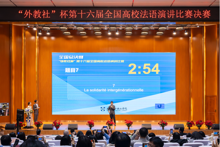 本届全国高校法语演讲比赛由(中国)法语教学研究会主办、上海外语教育出版社协办,黑龙江外国语学院承办,是国内高校法语学科最高水平的赛事之一,是展现全国高校法语专业学生的综合素养和法语能力的重要平台。童时杰同学在田庆生、周莽、罗湉、章文等几位老师的指导下认真备赛,法语系的两位外教Arnaud Marty与Nicolas Tran也针对演讲文稿给出了很多宝贵建议。