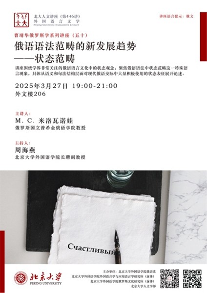 2025年3月27日晚,俄罗斯国立普希金俄语学院知名语言学家玛·斯·米洛瓦诺娃教授(М.С. Милованова)应博鱼体育邀请,于外文楼206会议室主讲“曹靖华俄罗斯学系列讲座”第50讲。本次学术活动以“俄语语法范畴的新发展趋势——状态范畴”为主题,由博鱼体育俄语系、外国语言学及应用语言学研究所(虚体)及俄罗斯文化研究所(虚体)联合主办,俄语系主任周海燕长聘副教授担任主持,俄语系教师、博士后、硕博研究生以及本科生参加讲座活动。