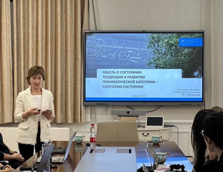 在开场致辞中,周海燕老师向与会者介绍了主讲人的学术成就:米洛瓦诺娃教授是俄罗斯语言学界的权威学者,现任普希金俄语学院普通语言学与俄语语言学系博士生导师,长期担任世界俄语教师联合会(МАПРЯЛ)会刊《国外俄语》(«Русский язык за рубежом»)编委,在语义学与语法学交叉领域成果丰硕,累计出版专著5部、发表核心期刊论文100余篇。