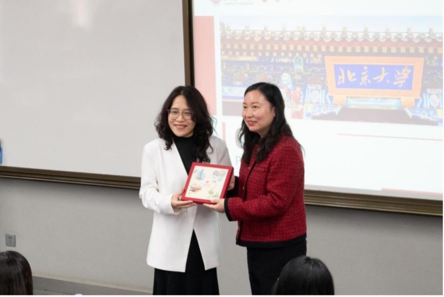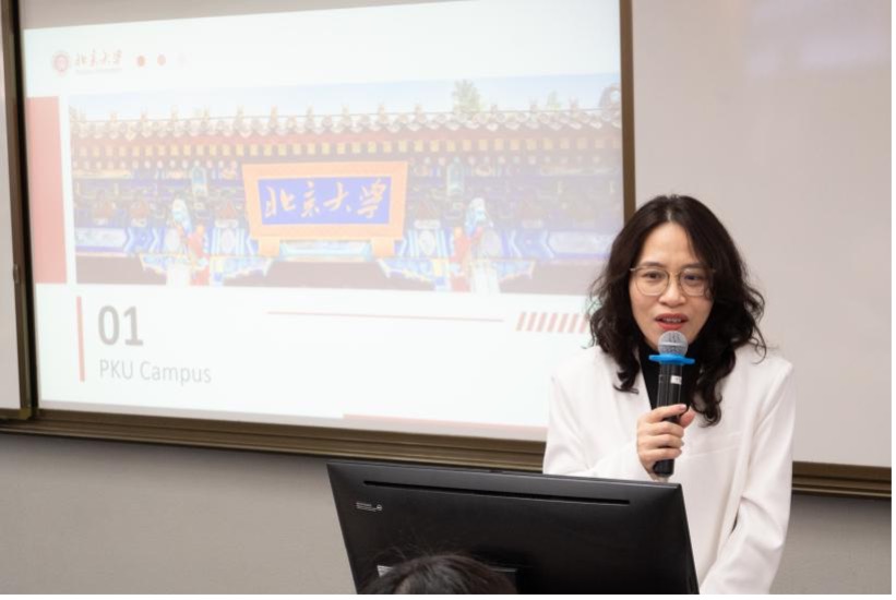 座谈会由越南语专业本科生郭凤桐担任主持人。谢昂老师首先代表北京大学越南语专业致辞,向越方代表团到访表示欢迎。谢昂老师提到,2025年正值中越建交75周年暨“中越人文交流年”,是中越两国人民,特别是两国青年进一步加强交流合作的良好契机。谢昂老师介绍了多年来越南历届国家领导人来访并与北京大学越南语专业师生进行交流的情况。随后,刘翠红博士致辞,介绍了新闻与宣传学院的专业构成、培养目标和教育理念,对两校日后更密切的交流提出期望,同时欢迎北京大学师生来越南访问交流。
