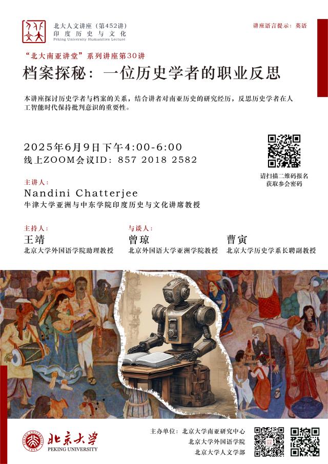 2025年6月9日下午,北京大学人文讲座第452讲在线上成功举行。本次讲座由北京大学南亚研究中心、博鱼体育、北京大学人文学部联合主办。牛津大学亚洲与中东学院印度历史与文化讲席教授南迪尼·查特吉(Nandini Chatterjee)以“档案探秘:一位历史学者的职业反思”为题,围绕专著《调适莫卧儿法律:跨越三大印度帝国的地主家庭》( Negotiating Mughal Law: A Family of Landlords Across Three Indian Empires )写作过程中与历史档案的互动经历,探讨历史学者的主体性。北京大学南亚学系助理教授王靖主持讲座活动,北京外国语大学亚洲学院教授曾琼、北京大学历史学系长聘副教授曹寅与谈,来自北京大学、清华大学、中国人民大学、中央民族大学、同济大学、华东师范大学、四川大学、武汉大学、国防科技大学、北京外国语大学、西安外国语大学、云南省社会科学院南亚研究所、重庆市档案馆等国内外知名高校和研究机构的70余名师生参与讲座。