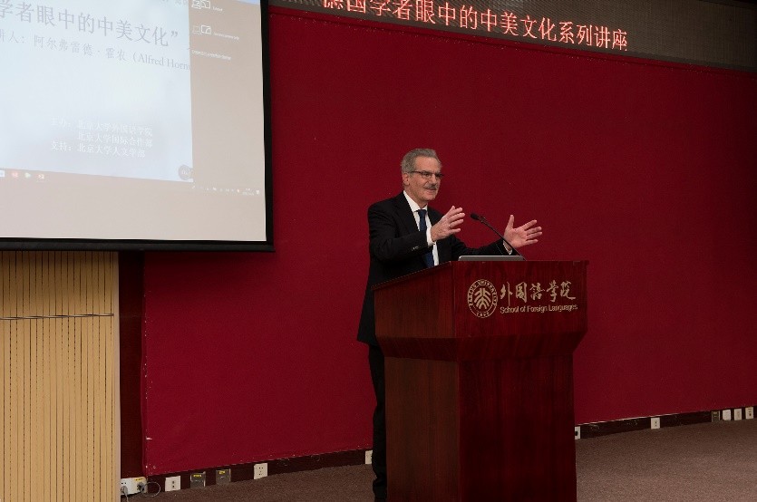 金秋十月,燕园层林尽染,硕果累累。2018年10月26日至28日,在北京大学人文学部的鼎力支持下,博鱼体育与国际合作部联合举办高端学术讲学计划,特邀欧洲科学院院士阿尔弗雷德•霍农(Alfred Hornung)教授做了题为“德国学者眼中的中美文化”的系列讲座。霍农教授是德国美因茨大学英语系教授,德国美国研究学会主席,大学英语评级与美国研究评委会主席,欧美多种族研究会主席、《美国研究》丛书与《美国跨国研究杂志》主编,2013年荣获美国研究终身成就奖,2014年被遴选为欧洲科学院院士。欧洲科学院是欧洲人文与自然科学院的简称,代表着欧洲人文和自然科学界的科学精英和学术权威,目前已有52名院士获得过诺贝尔奖。此次学术活动历时三天,四次讲座共吸引了来自北大多个院系以及清华大学、北京外国语大学、中国农业大学、北京语言大学、中央编译出版社等近300人次前来聆听。