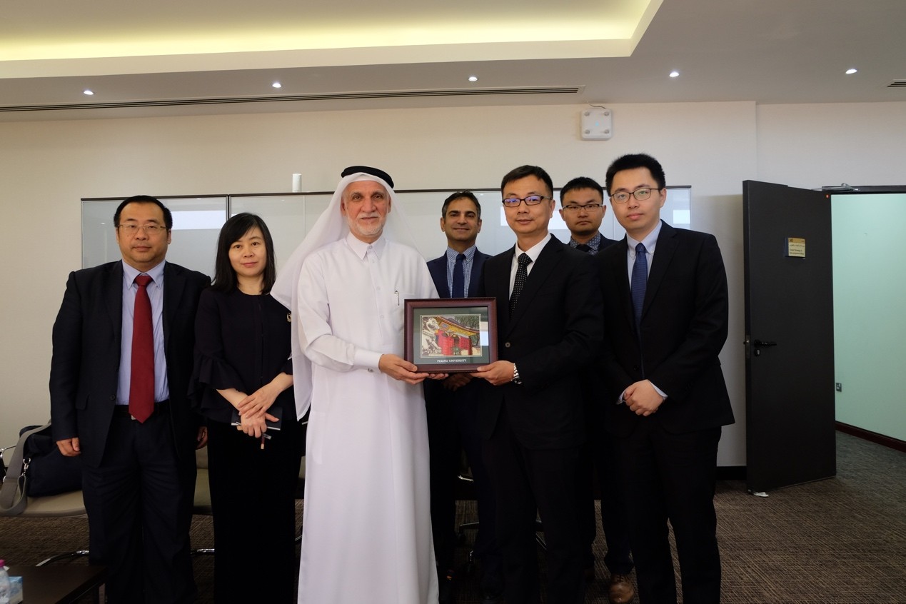 4月17日至20日在卡塔尔访问期间,代表团第一站参访机构为卡塔尔大学。卡塔尔大学副校长达尔维什•阿卜杜拉赫曼(Darwish Abdulrahman H. Al-Emadi)、副校长欧麦尔•安萨里(Omar Al-Ansari)、副校长哈立德•哈提尔(Khalid Al-Khater)和国际事务处处长凯撒•沃曾(Cesar Wazen)接见了团队师生。北京大学卡塔尔讲席教授吴冰冰博士首先向卡塔尔大学方面介绍了卡塔尔讲席在北京大学的运作现状和未来的发展规划,以及外国语学院国别和区域研究专业的基本情况,副校长达尔维什对此给予了肯定与赞赏。双方还表示,希望能够进一步扩展北京大学与卡塔尔大学的合作空间,在继续夯实和加强卡塔尔大学与外国语学院合作的基础上,充分发挥两所大学的综合性优势,寻求两校在医学研究领域的合作空间。会谈结束后,团队师生在工作人员的带领下参观了卡塔尔大学校园。