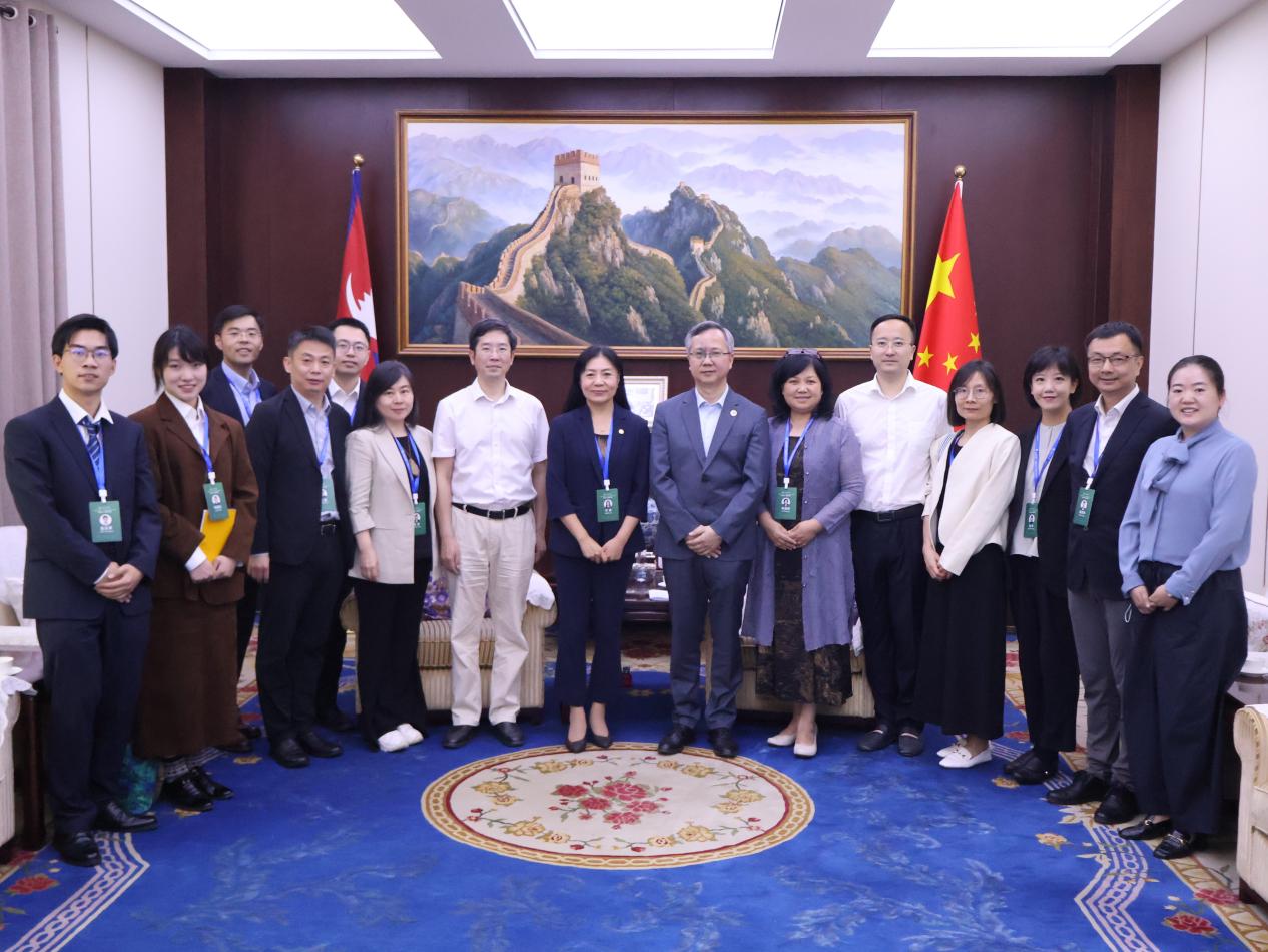随后,调研团拜会了中国驻尼泊尔大使馆,与陈松大使举行会谈。陈松全面介绍了当前中尼两国在政治、经济、文化等领域的务实合作与交流进展,并结合中国周边外交政策与实践,对学界提出殷切期望。他鼓励调研团师生们积极构建具有中国特色的周边外交理论体系和学科体系。宁琦感谢陈松大使对调研活动的支持,并介绍了北大在与尼泊尔相关的人才培养、学术合作及高层交流等方面的工作成果,希望未来与尼泊尔相关机构在学生培养、国别研究等领域深化合作,共同推动中尼友好事业。调研团成员就中尼人文交流、青年论坛及学术合作等议题与陈大使深入交流。